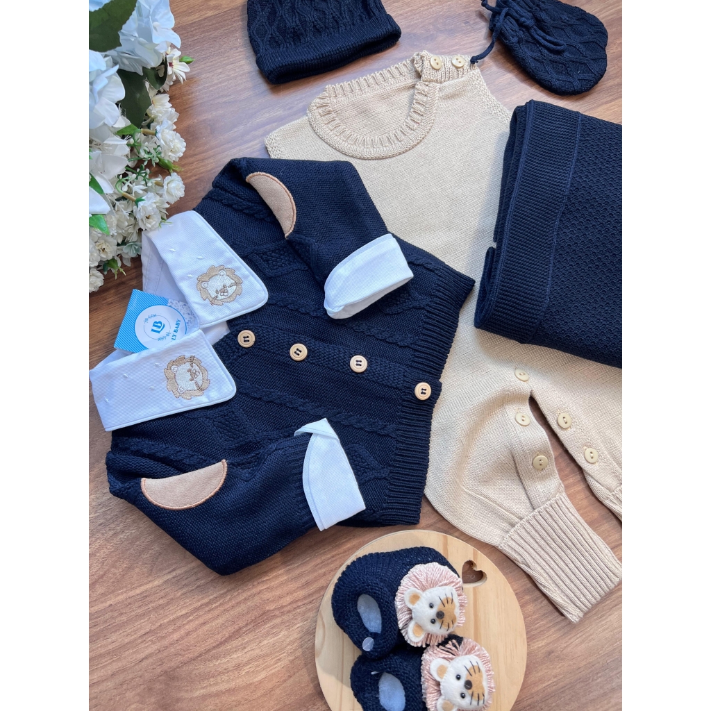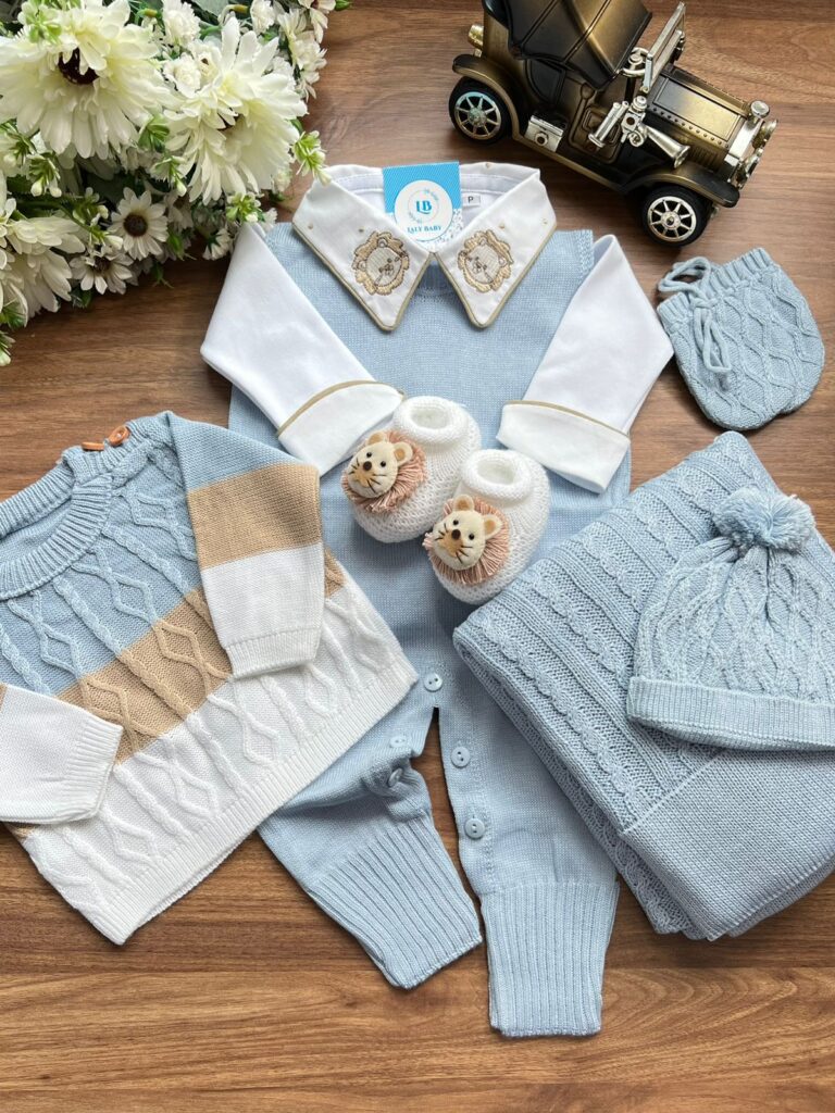 Nossa saída de maternidade é ideal para receber seu bebê com estilo e conforto. Toda em tricot super macio com fio antialérgico (100% acrílico). Tamanho único, veste bebês de 0 a 2 meses. O kit é composto por 3 peças, não acompanha o body (renda na gola e punho fazem parte do body).