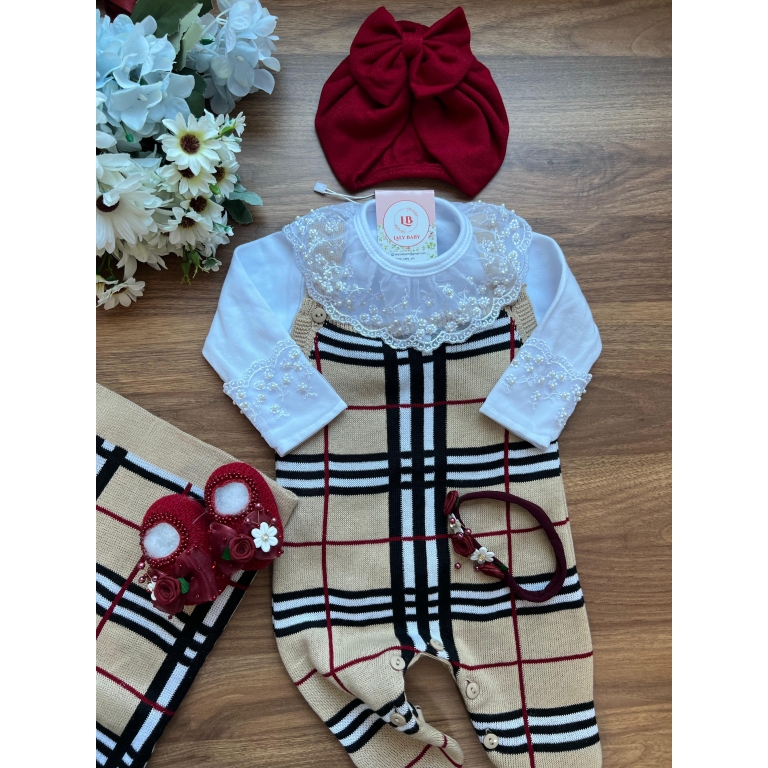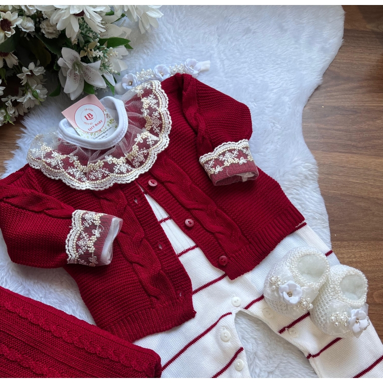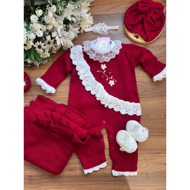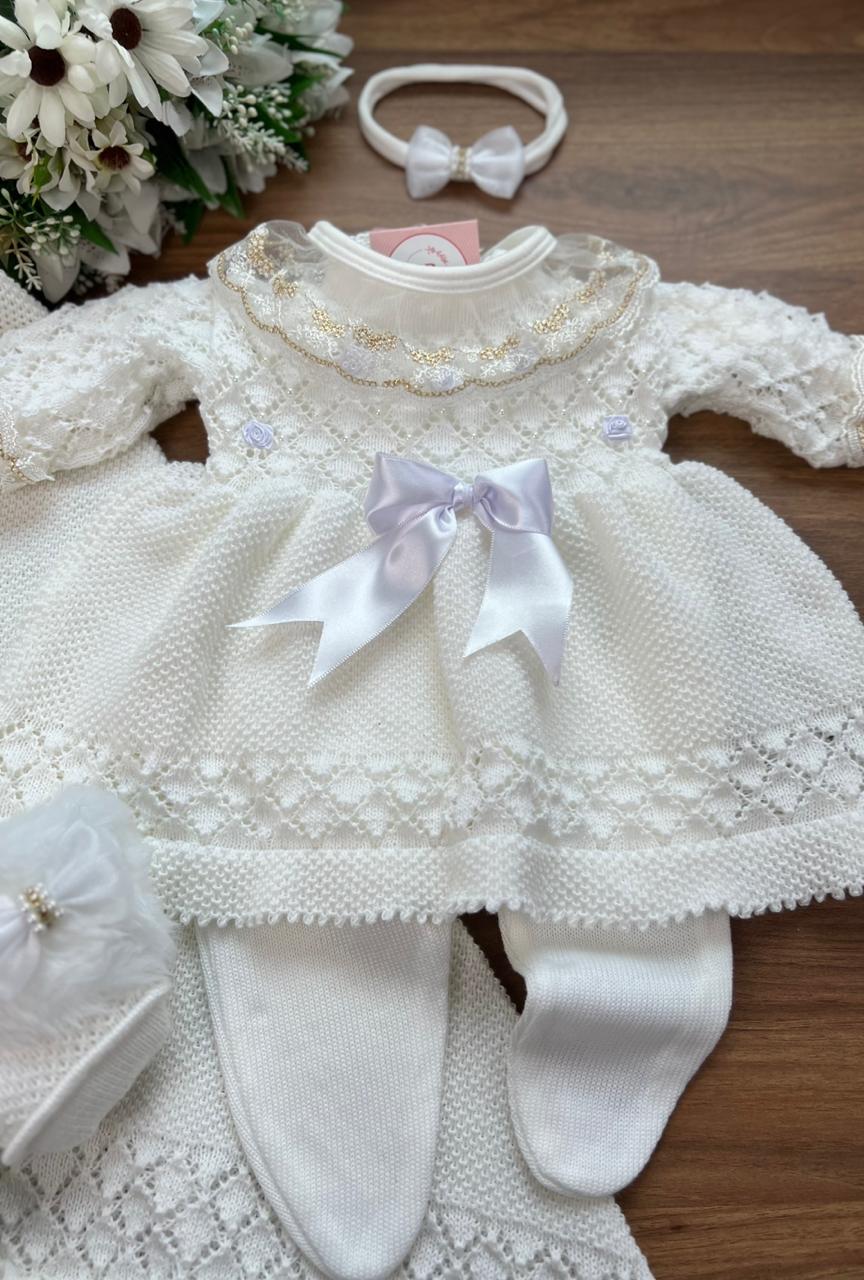 Nossa saída de maternidade é ideal para receber seu bebê com estilo e conforto. Tamanho único, veste bebês de 0 a 2 meses. O kit é composto por 3 peças, não acompanha o body (renda na gola e punho fazem parte do body).