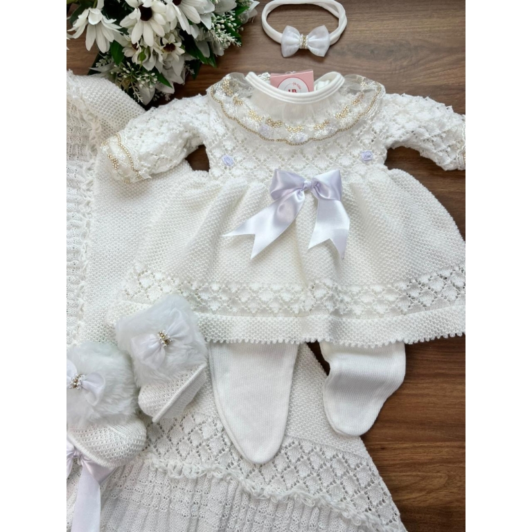 Nossa saída de maternidade é ideal para receber seu bebê com estilo e conforto. Tamanho único, veste bebês de 0 a 2 meses. O kit é composto por 2 peças, não acompanha o body (renda na gola e punho fazem parte do body).