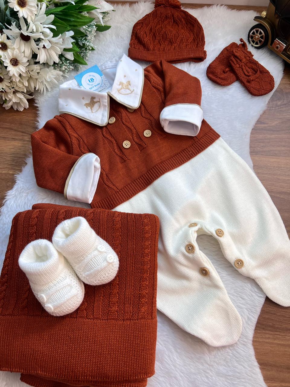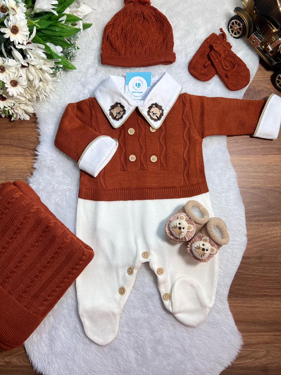 Nossa saída de maternidade é ideal para receber seu bebê com estilo e conforto. Tamanho único, veste bebês de 0 a 2 meses. O kit é composto por 3 peças, não acompanha o body (detalhe na gola e punho fazem parte do body).