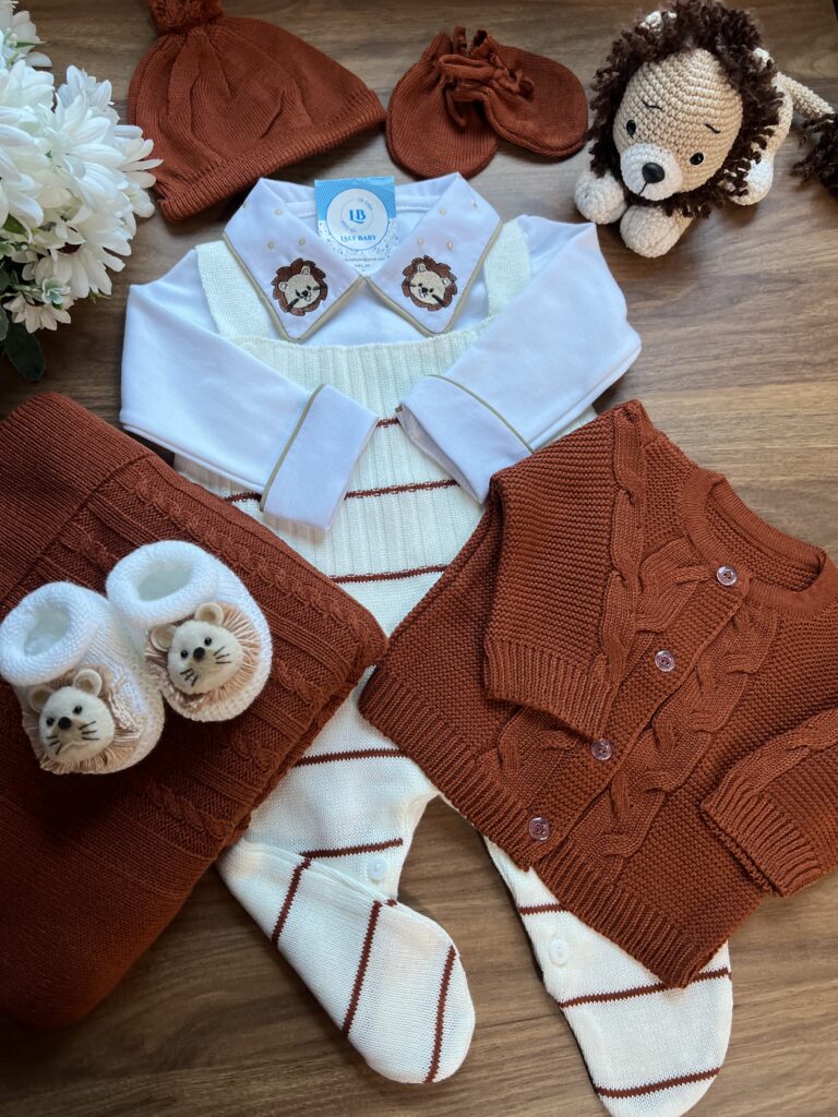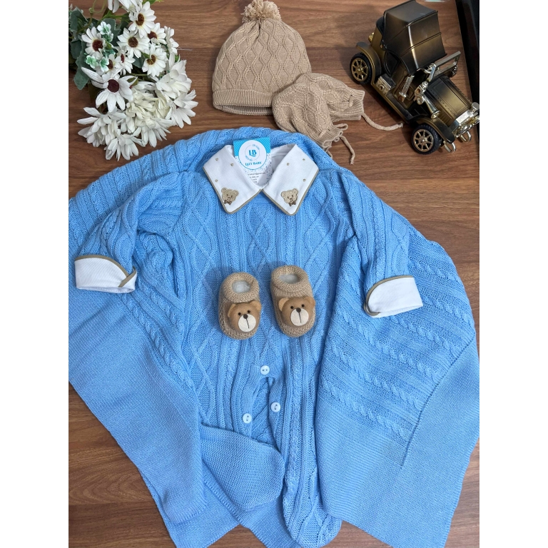Nossa saída de maternidade é ideal para receber seu bebê com estilo e conforto. Toda em tricot super macio com fio antialérgico (100% acrílico). Tamanho único, veste bebês de 0 a 2 meses. O kit é composto por 2 peças, não acompanha o body (detalhe gola e punho fazem parte do body).