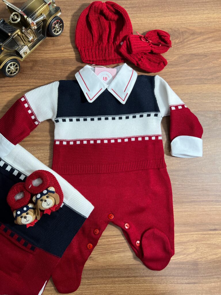 Nossa saída de maternidade é ideal para receber seu bebê com estilo e conforto. Toda em tricot super macio com fio antialérgico (100% acrílico). Tamanho único, veste bebês de 0 a 2 meses. O kit é composto por 3 peças, não acompanha o body (detalhe gola e punho fazem parte do body).