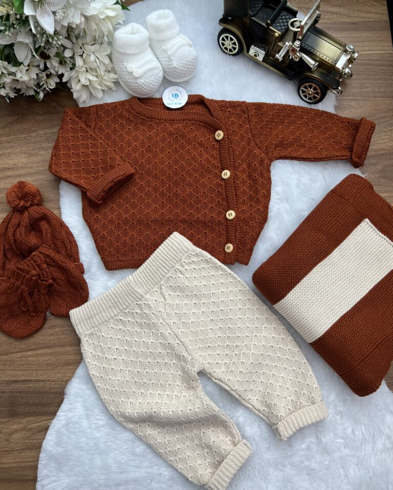 Nossa saída de maternidade é ideal para receber seu bebê com estilo e conforto. Toda em tricot super macio com fio antialérgico (100% acrílico). Tamanho único, veste bebês de 0 a 2 meses. O kit é composto por 2 peças, não acompanha o body (detalhe na gola e punho fazem parte do body).