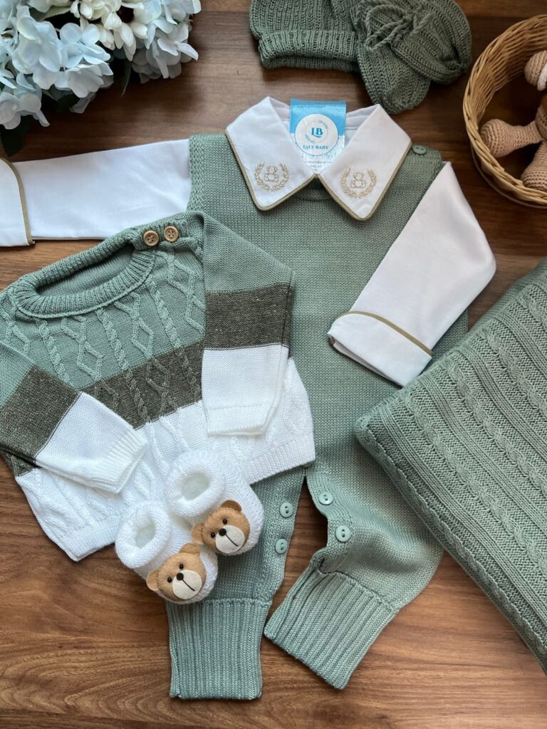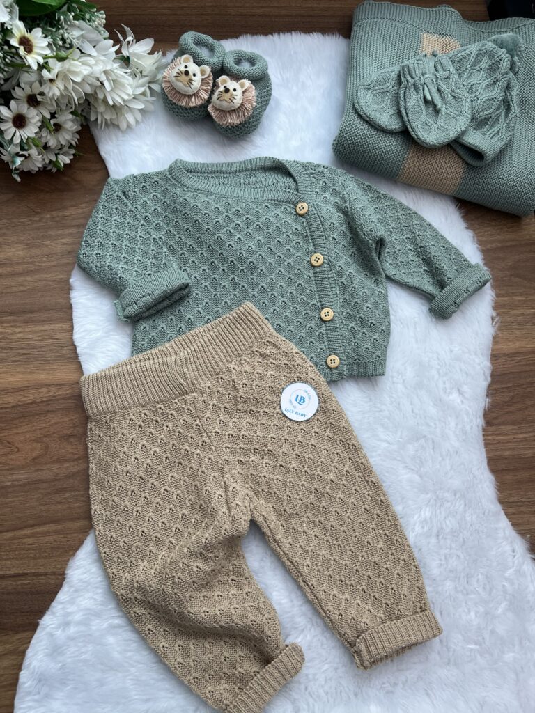 Nossa saída de maternidade é ideal para receber seu bebê com estilo e conforto. Toda em tricot super macio com fio antialérgico (100% acrílico).Tamanho único, veste bebês de 0 a 2 meses. O kit é composto por 3 peças, não acompanha o body (detalhe na gola e punho fazem parte do body).