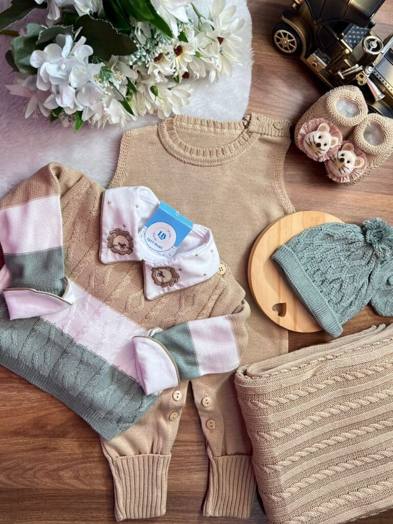 Nossa saída de maternidade é ideal para receber seu bebê com estilo e conforto. Toda em tricot super macio com fio antialérgico (100% acrílico). Tamanho único, veste bebês de 0 a 2 meses. O kit é composto por 3 peças, não acompanha o body (detalhe gola e punho fazem parte do body).