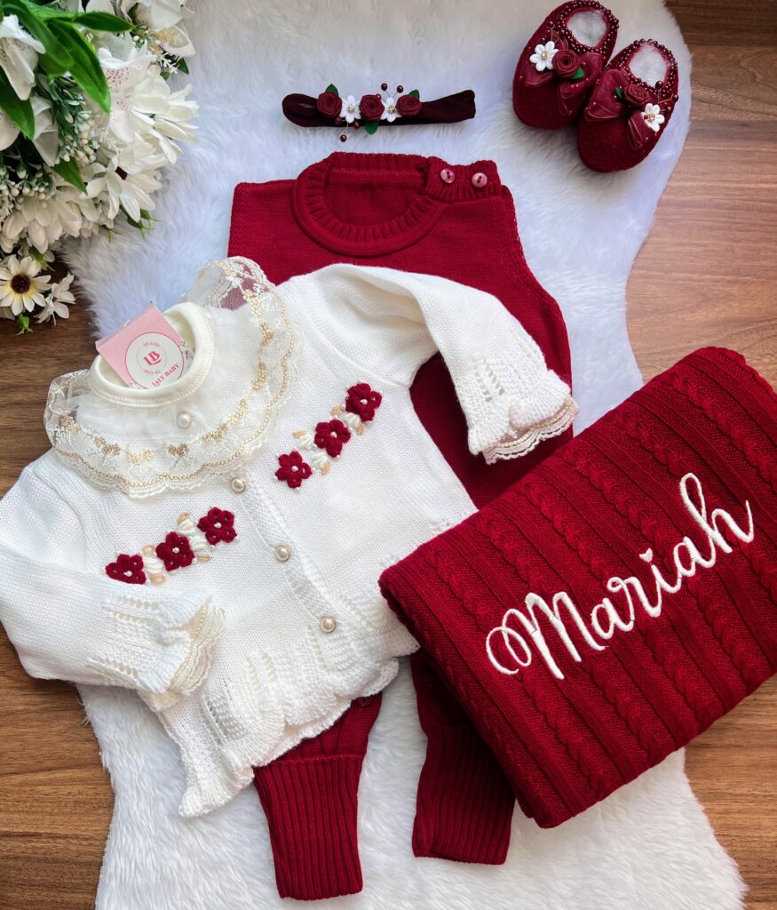 Nossa saída de maternidade é ideal para receber seu bebê com estilo e conforto. Tamanho único, veste bebês de 0 a 2 meses. O kit é composto por 3 peças, não acompanha o body (renda gola e punho fazem parte do body).