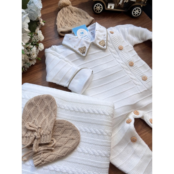 Nossa saída de maternidade é ideal para receber seu bebê com estilo e conforto. Toda em tricot super macio com fio antialérgico (100% acrílico). Tamanho único, veste bebês de 0 a 2 meses. O kit é composto por 2 peças, não acompanha o body (detalhe gola e punho fazem parte do body).