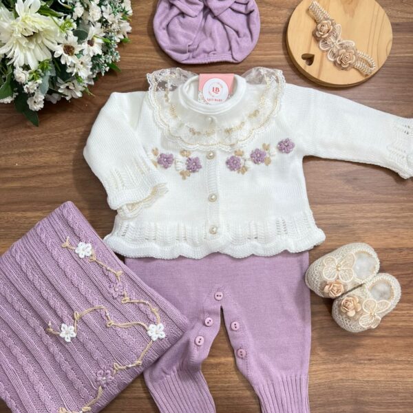Nossa saída de maternidade é ideal para receber seu bebê com estilo e conforto. Toda em tricô em linha 100% acrílico antialérgico. Tamanho único, veste bebês de 0 a 2 meses. O kit é composto por 3 peças, não acompanha o body (renda gola e punho fazem parte do body).