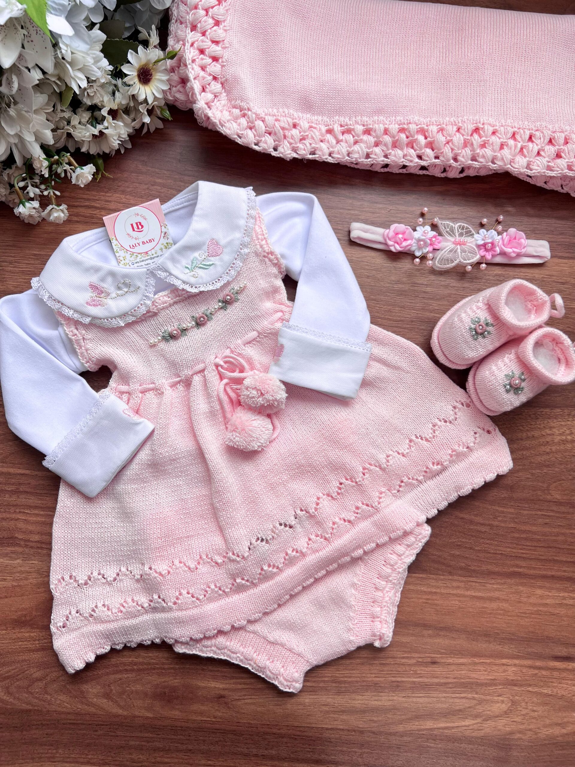 Nossa saída de maternidade é ideal para receber seu bebê com estilo e conforto. Toda em tricot super macio com fio antialérgico (100% acrílico). Tamanho único, veste bebês de 0 a 2 meses. O kit é composto por 3 peças, não acompanha o body (renda na gola e punho fazem parte do body).