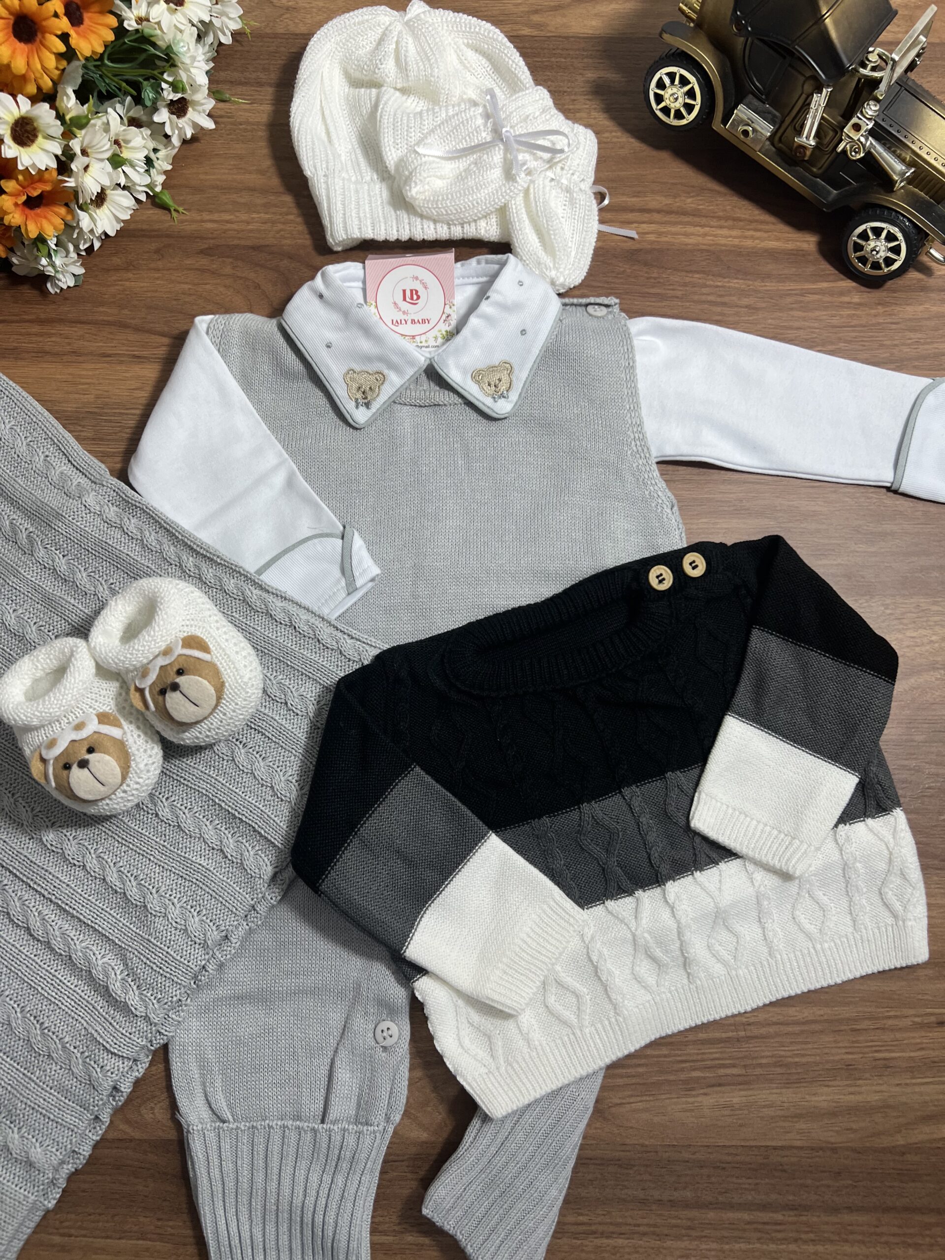 Nossa saída de maternidade é ideal para receber seu bebê com estilo e conforto. Toda em tricot super macio com fio antialérgico (100% acrílico). Tamanho único, veste bebês de 0 a 2 meses. O kit é composto por 3 peças, não acompanha o body (detalhe gola e punho fazem parte do body).