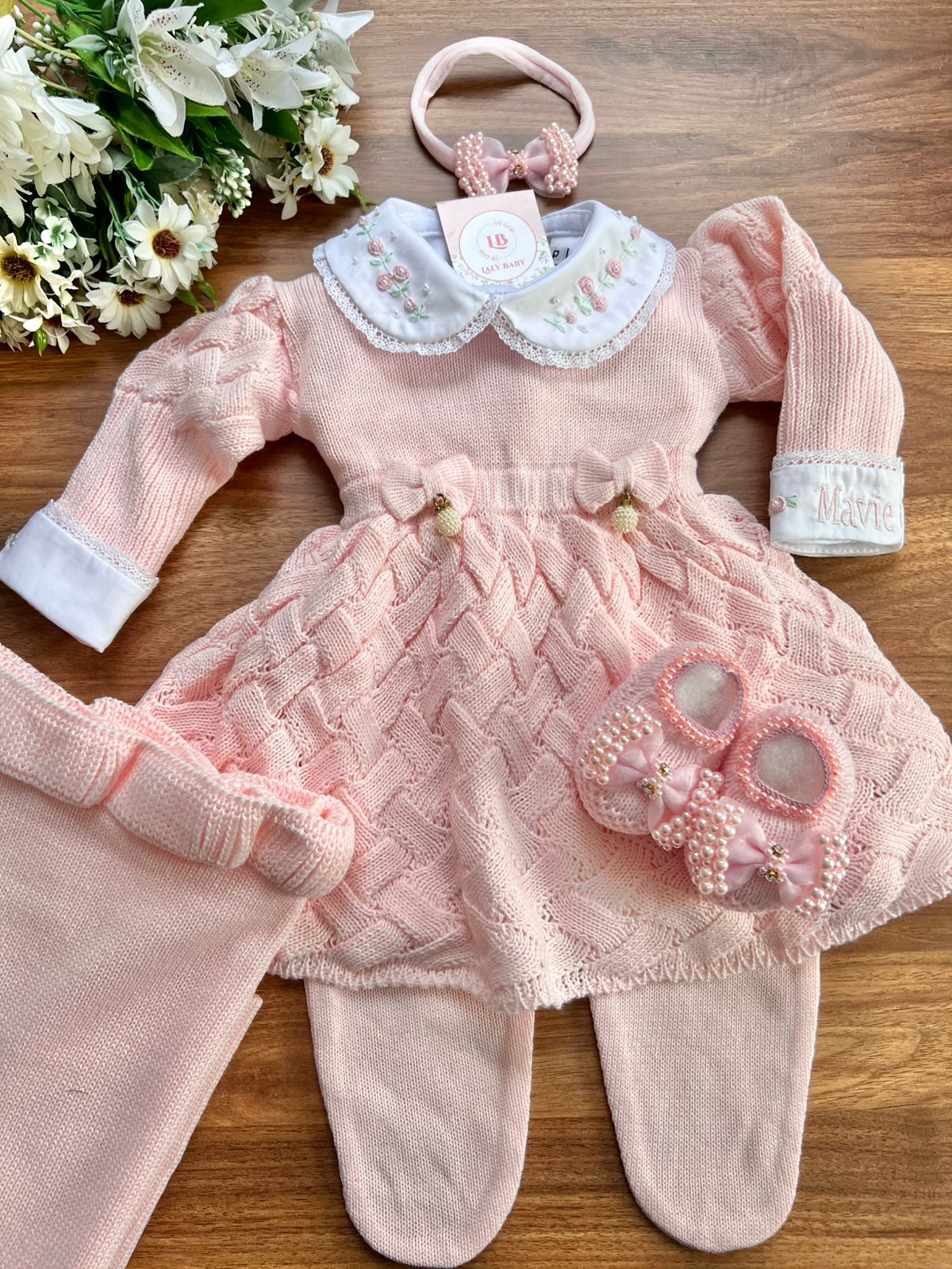 Nossa saída de maternidade é ideal para receber seu bebê com estilo e conforto. Tamanho único, veste bebês de 0 a 2 meses. O kit é composto por 3 peças, não acompanha o body (renda na gola e punho fazem parte do body).
