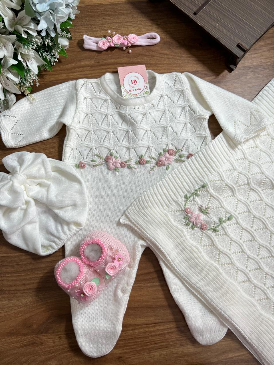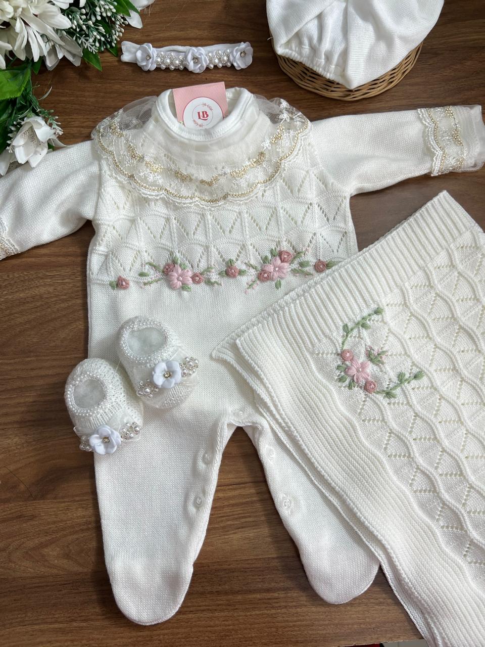 Nossa saída de maternidade é ideal para receber seu bebê com estilo e conforto. Tamanho único, veste bebês de 0 a 2 meses. O kit é composto por 2 peças, não acompanha o body (renda na gola e punho fazem parte do body).