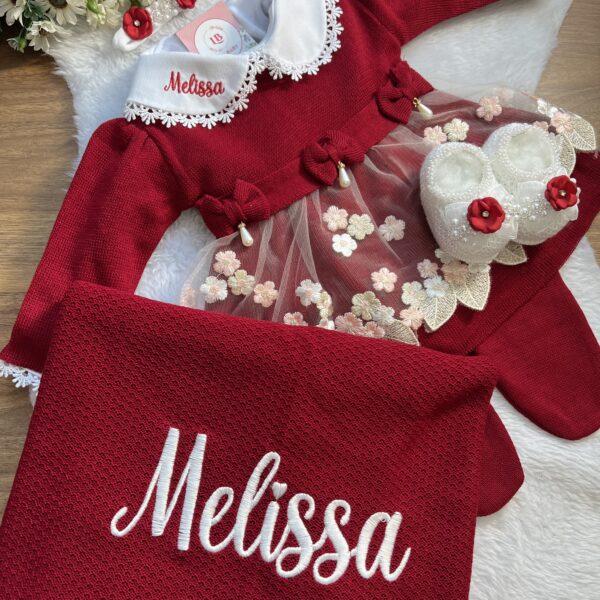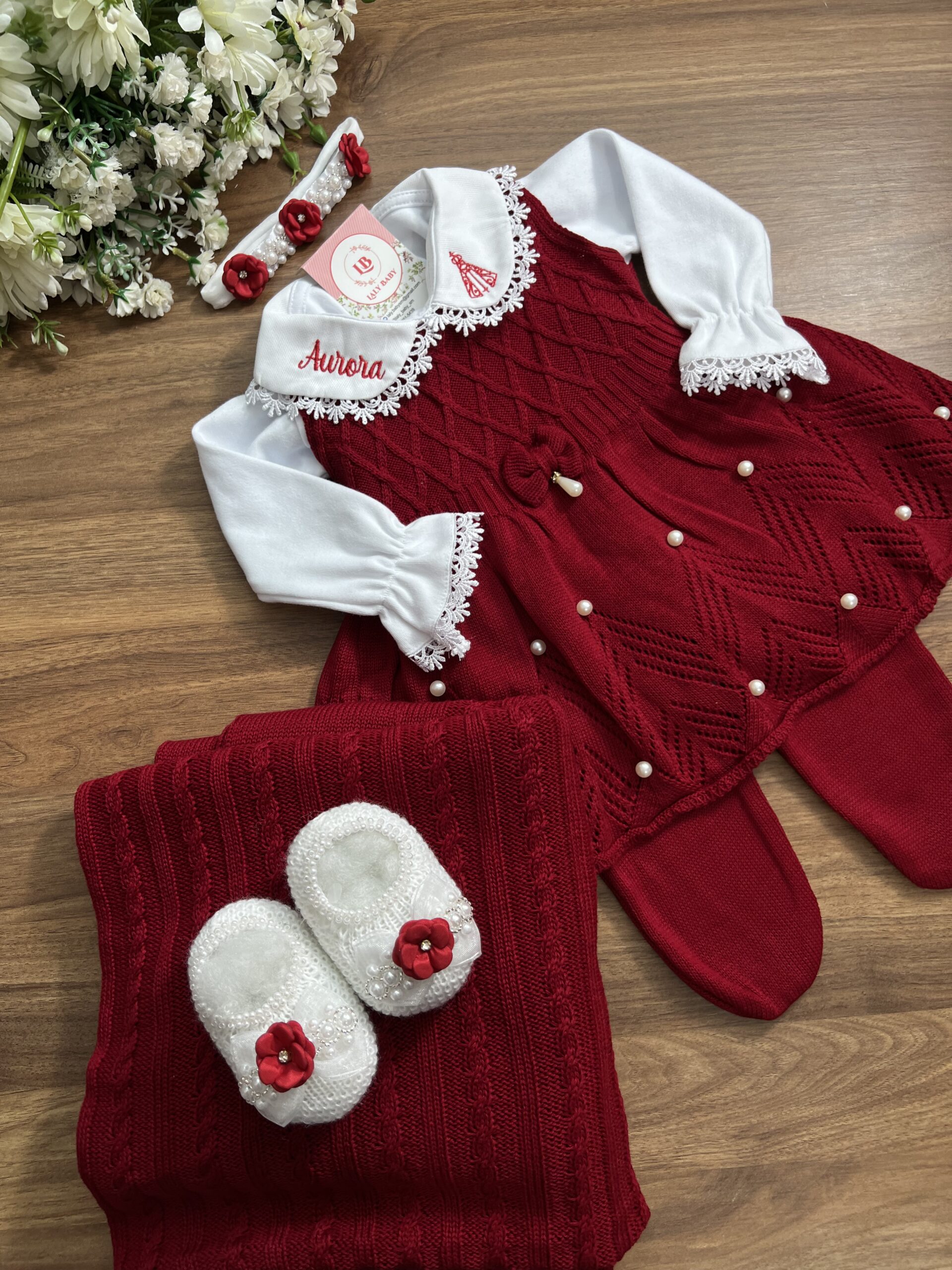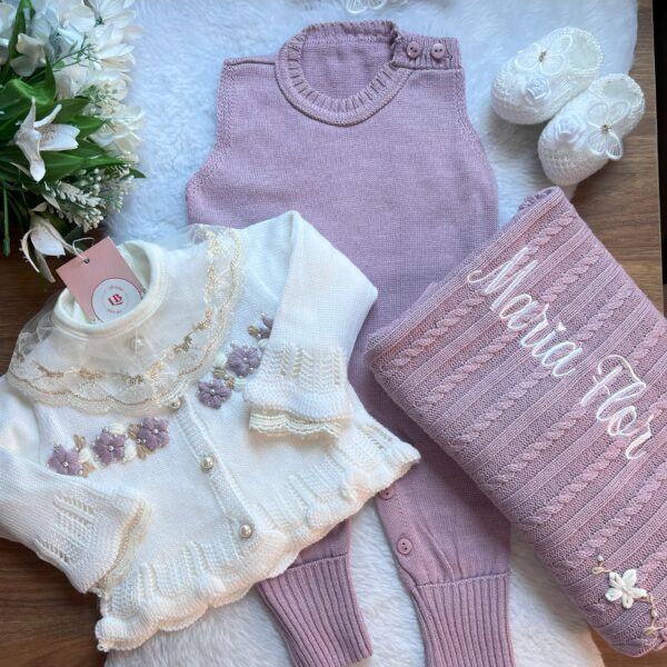 Nossa saída de maternidade é ideal para receber seu bebê com estilo e conforto. Toda em tricot super macio com fio antialérgico (100% acrílico). Tamanho único, veste bebês de 0 a 2 meses. O kit é composto por 3 peças, não acompanha o body (renda na gola e punho fazem parte do body).