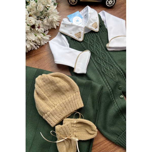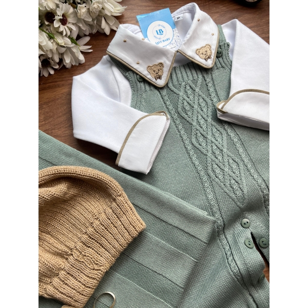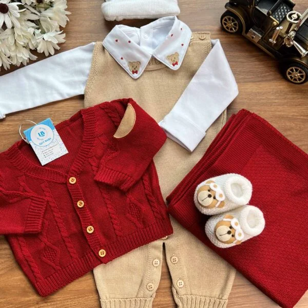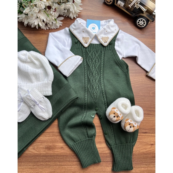 Nossa saída de maternidade é ideal para receber seu bebê com estilo e conforto. Toda em tricot super macio com fio antialérgico (100% acrílico). Tamanho único, veste bebês de 0 a 2 meses. O kit é composto por 2 peças, não acompanha o body (detalhe gola e punho fazem parte do body).
