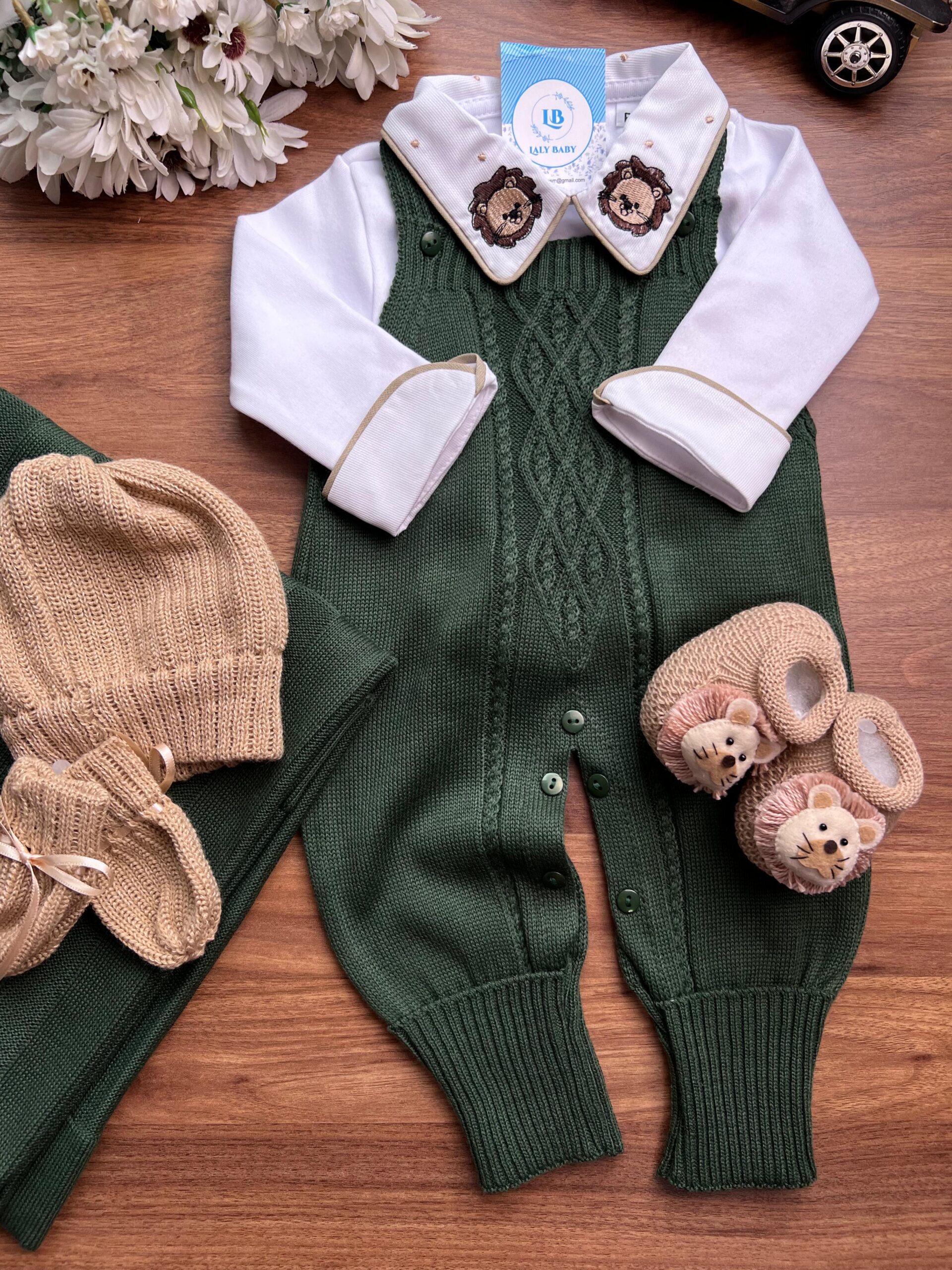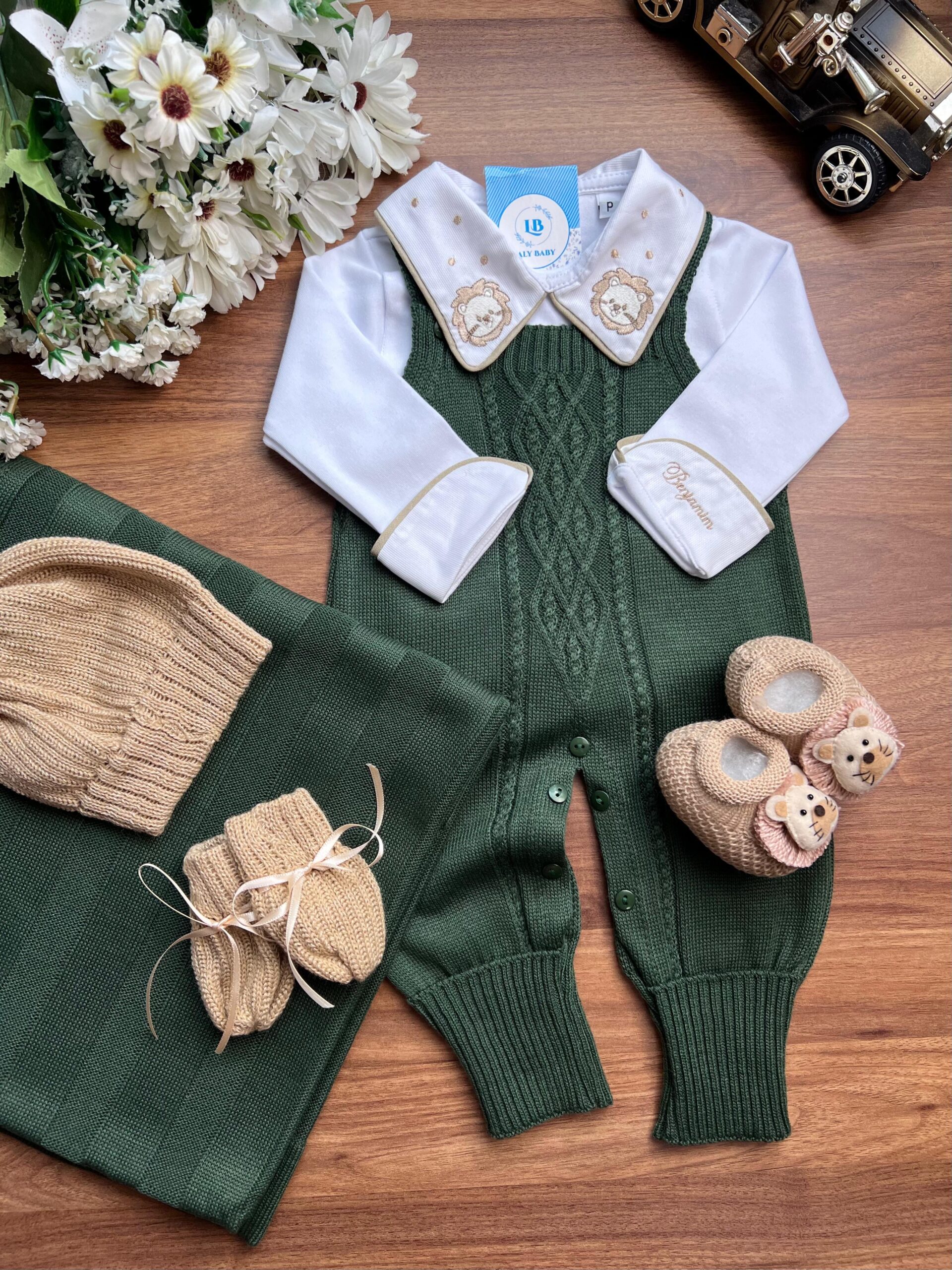 Nossa saída de maternidade é ideal para receber seu bebê com estilo e conforto. Tamanho único, veste bebês de 0 a 2 meses. O kit é composto por 2 peças, não acompanha o body (detalhe na gola e punho fazem parte do body).