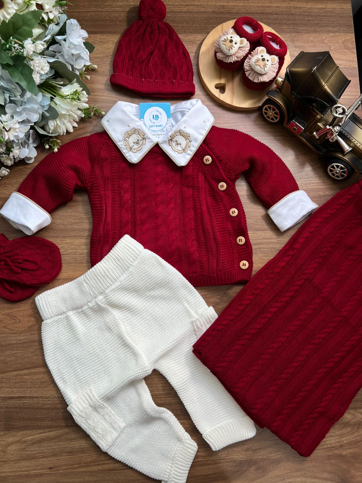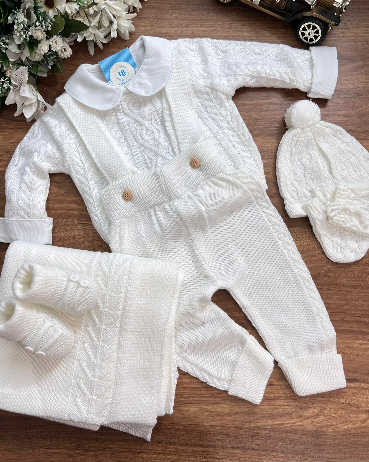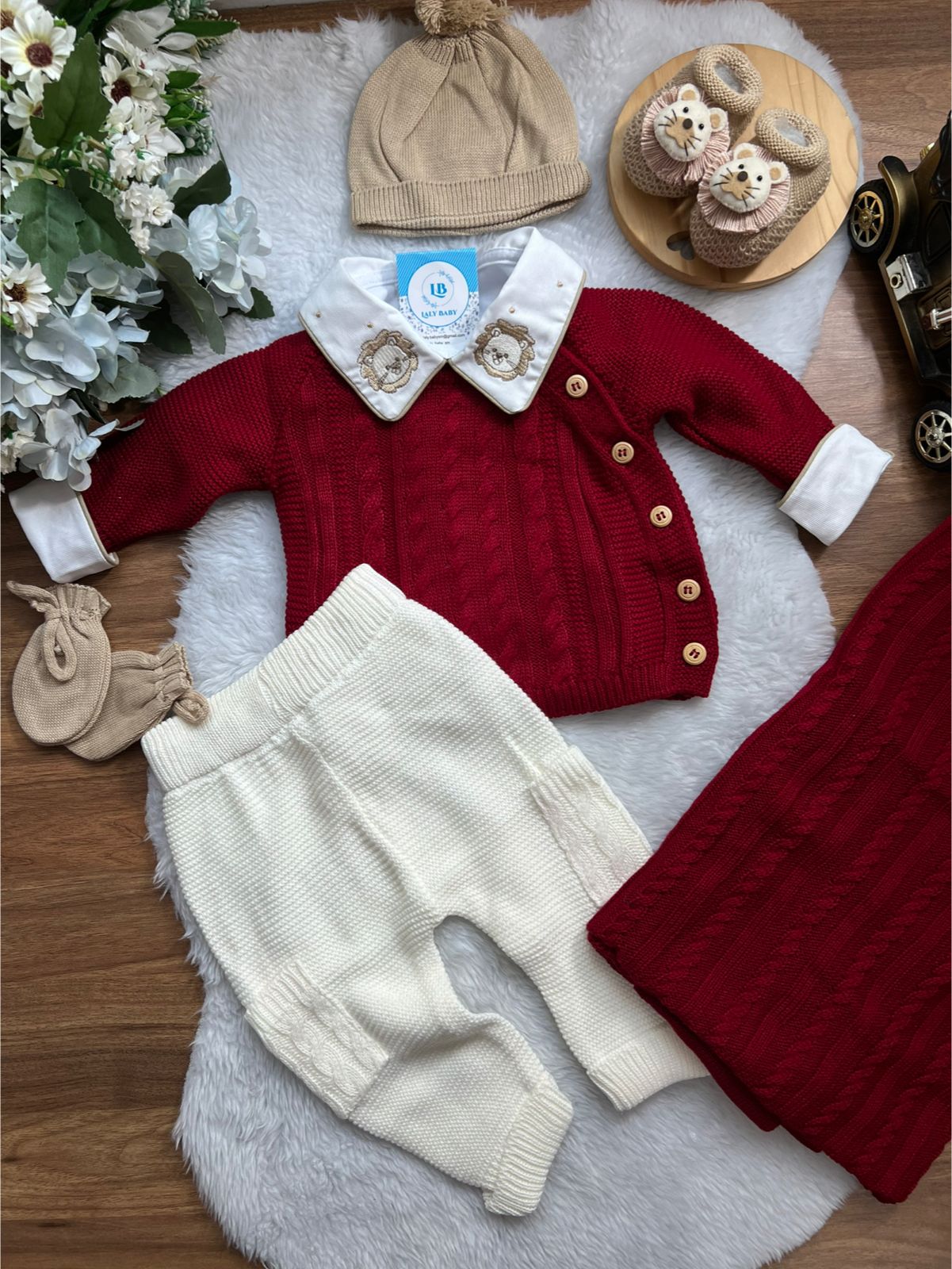 Nossa saída de maternidade é ideal para receber seu bebê com estilo e conforto. Toda em tricot super macio com fio antialérgico (100% acrílico). Tamanho único, veste bebês de 0 a 2 meses. O kit é composto por 3 peças, não acompanha o body (detalhe na gola e punho fazem parte do body).