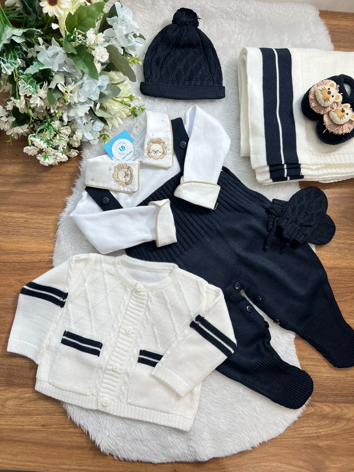 Nossa saída de maternidade é ideal para receber seu bebê com estilo e conforto. Toda em tricot super macio com fio antialérgico (100% acrílico). Tamanho único, veste bebês de 0 a 2 meses. O kit é composto por 3 peças, não acompanha o body (detalhe na gola e punho fazem parte do body).