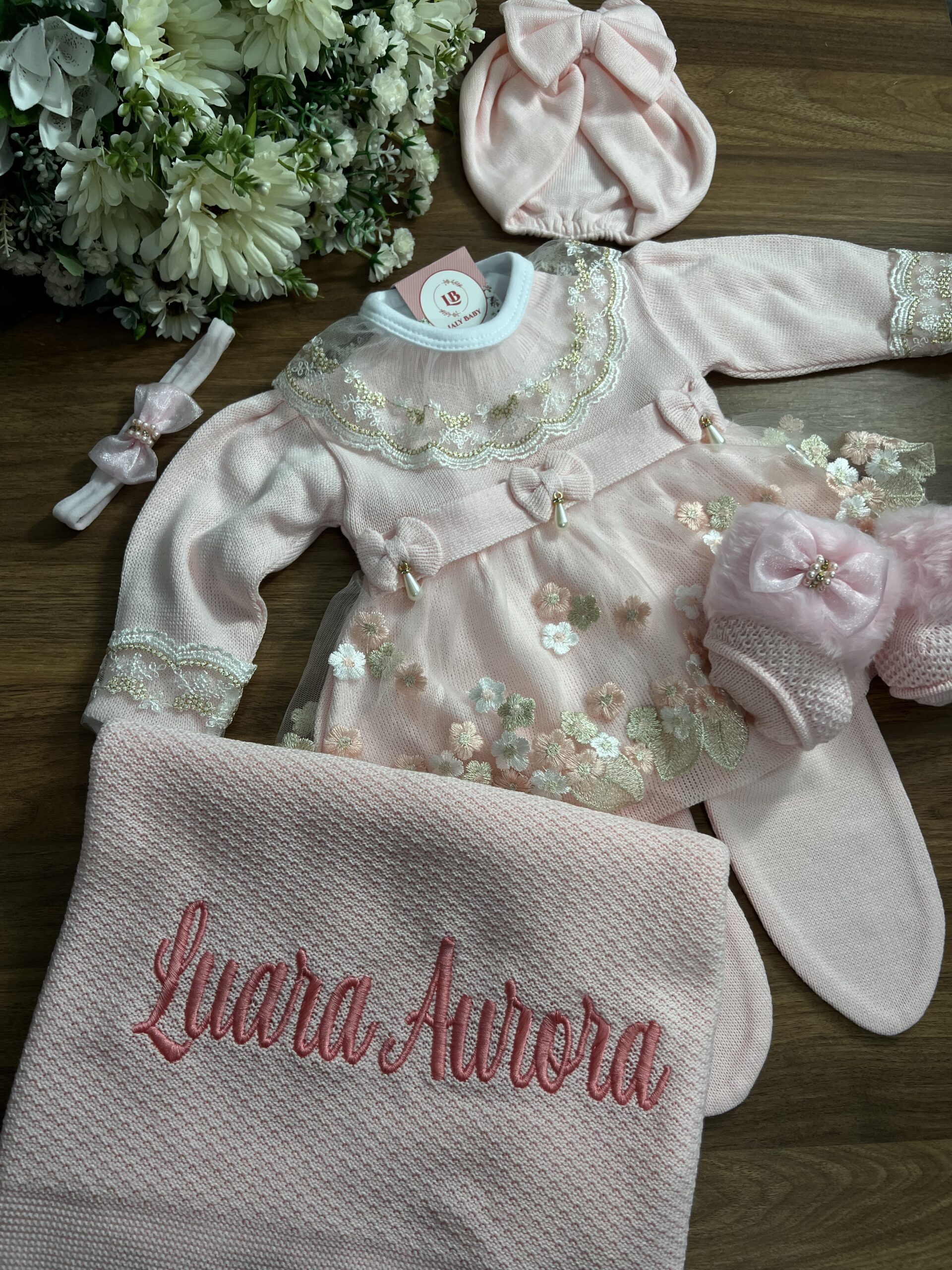 Nossa saída de maternidade é ideal para receber seu bebê com estilo e conforto. Toda em tricô em linha 100% acrílico antialérgico. Tamanho único, veste bebês de 0 a 2 meses. O kit é composto por 3 peças, não acompanha o body (renda gola e punho fazem parte do body).