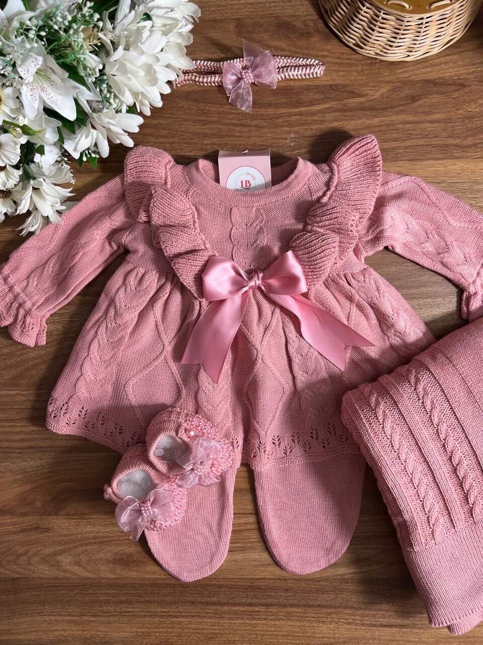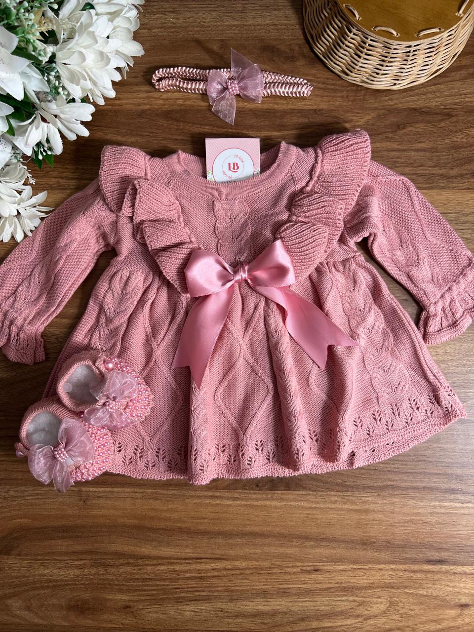 Nossa saída de maternidade é ideal para receber seu bebê com estilo e conforto. Toda em tricot super macio com fio antialérgico (100% acrílico). Tamanho único, veste bebês de 0 a 2 meses. O kit é composto por 3 peças, não acompanha o body (renda na gola e punho fazem parte do body).